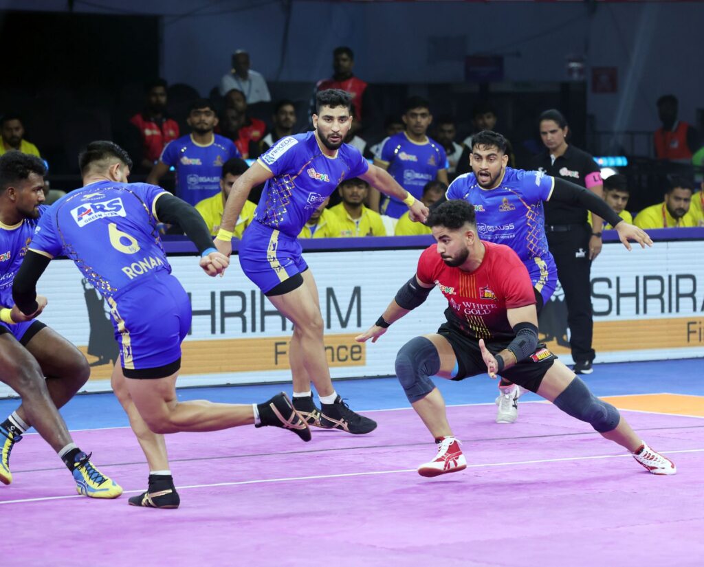 However, the Thalaivas struck back just as effectively, with Arjun Deshwal orchestrating raids and Rohit Beniwal keeping the scoreboard ticking. The seesaw battle ensured that neither side could break away, as every successful raid was quickly matched by the opposition.