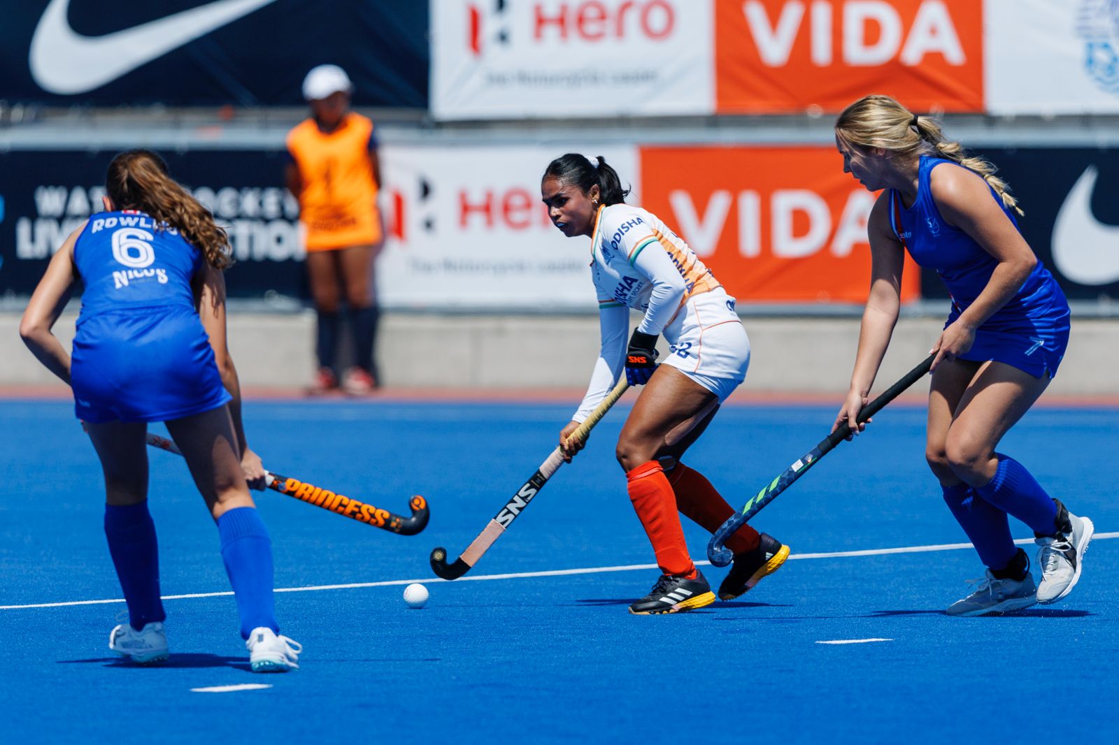 India sprung into action from the get-go, registering their first shot on target and forcing a save out of the Namibia keeper in the opening thirty seconds of this contest. They remained on the front foot in search of a goal, earning a Penalty Corner with close to six minutes to go in the first quarter. They eventually made the early pressure count and bagged four goals in as many minutes to take control of the game. Sakshi Rana (10’) opened the scoring with a brilliant reverse flick and Kanika Siwach (12’) soon doubled their lead with a powerful finish. Binima Dhan (14’) added a third with a sharp run and finish, while Sonam (14’) scored a fourth after some neat interplay in the buildup, giving India a 4-0 lead after the opening fifteen minutes.