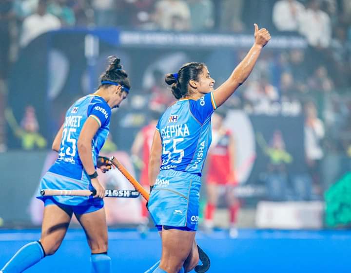 It didn’t take long for India to click into gear today as Neha pinched the ball in midfield and found Navneet Kaur, who quickly passed the ball to Sangita Kumari in the shooting circle. Sangita unleashed a reverse tomahawk to beat the on-rushing Korean goalkeeper Kim Eunji and score the first goal for India within minutes of the start. India continued to employ a high press causing Korea to struggle to make inroads towards the Indian goal, on the other hand, the Korean defensive unit constantly harried the Indian forwards to prevent any further goal scoring chances in the first quarter.